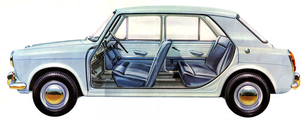Forget... the radiator. A special tank absorbs expansion, feeds it back after expansion. You hardly ever need to top Up. FORGET the oil filter. A warning light on the fascia panel tells you when it's time to change the element. FORGET suspension troubles. There are few moving parts, no maintenance ever. FORGET the worries of greasing. Only four lubrication points to need attention, every 3,000 miles. FORGET fading brakes. Outsize disc brakes, fitted on front wheels, mean an end to fading and failing. FORGET little fingers. The doors are fitted with childproof safety locks. FORGET engine and road noise. The'Hydrolastic'* suspension can't squeak, the engine is rubber-mounted on the sub-frame, the body is rigid, welded steel, the aerodynamic body wind-tunnel tested for 'hush'. |