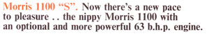 Dramatically different from bonnet to boot, styled to look like the future, with stretch-out comfort for four or five and the safest ride on wheels, the miraculous BMC Morris 1100 is the compact car that puts the family first! Curise all day at 35 m.p.g. Stop on disc brakes at the front. Relax handling a frontwheel drive that takes the trials out of traffic. Get into the BMC Morris 1100 and go - you've never driven a family car like it! |
