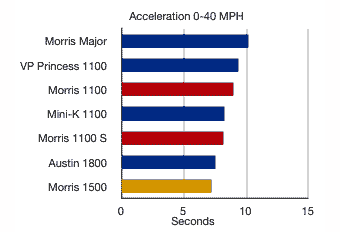Open road accelerationThe 0-60 MPH acceleration graph shows just what a dramatic difference exists between the 1100 S and the original 1100 - nearly 7 seconds - and that the Morris 1500 (the Civilized Sports car) was 2 seconds faster again - a whopping 9 second improvement over the original 1100.Interestingly, the 1100 S shows greater improvement at faster speeds suggesting its overall gearing is biased towards relaxed high speed cruising rather than startling low speed acceleration. At the time of release of the 1100 S there was considerable debate over which final drive ratio to adopt. The first 3,000 of the 1100 S received the high 3.76 ratio, but BMC changed to the lower ratio (4.13) used on the English 1,098cc cars, including the Princess 1100, which may have improved the 0-40 times. | ![]() |